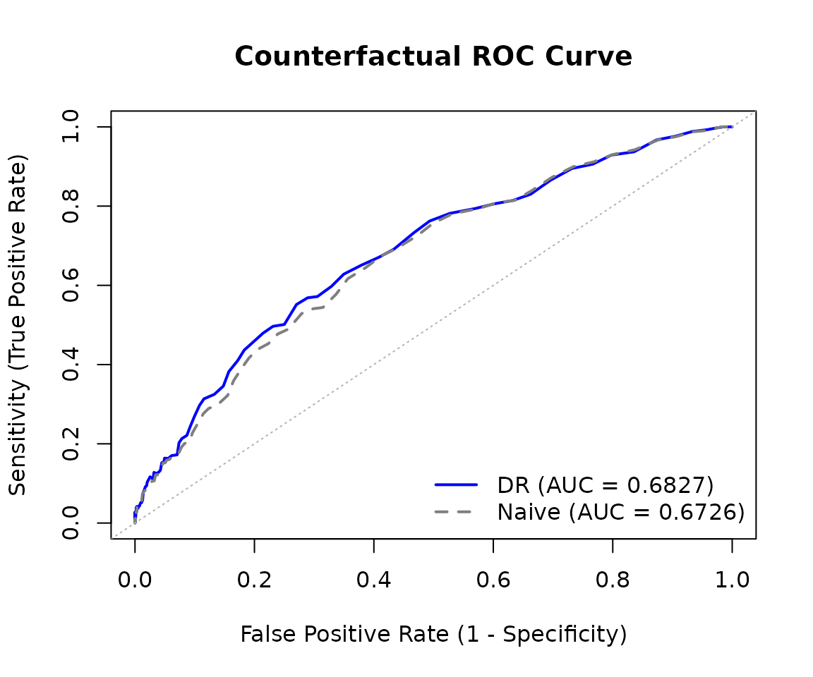 #> Naive estimate: 0.1086The doubly robust estimator adjusts for confounding using both a propensity score model and an outcome model, providing consistent estimates even if one model is misspecified.